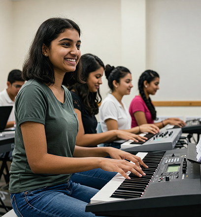 All sessions are conducted in small batches (5-6 learners) to ensure personalized attention. Students receive structured feedback and practical sessions with real pianos and keyboards.